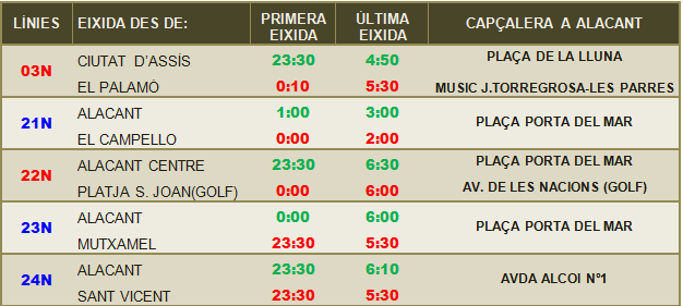 ( 21N ) 21N: Alicante (Plaza Puerta del Mar) - Playa San Juan - El Campello( 23N ) 23N: Alicante (Plaza Puerta del Mar) - Sant Joan - Mutxamel( 24N ) 24N: Alicante (Plaza del Mar) - Universidad de Alicante - San Vicente del Raspeig