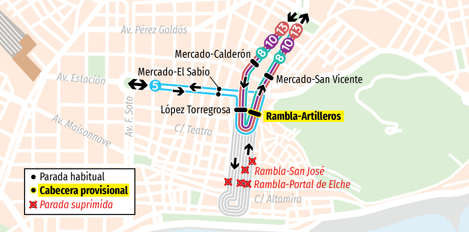 ( 05 ) 05: Rambla - San Agustín( 10 ) 10: Rambla - Vía Parque (C.C. Vistahermosa)( 13 ) 13: Rambla - Villafranqueza( 08 ) 8: Rambla - Virgen Del Remedio
