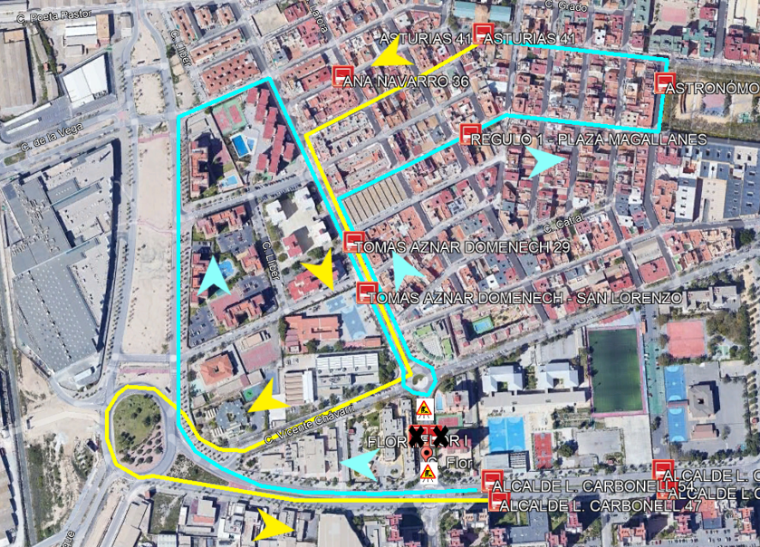 Sentido Florida: Desde la Av. alcalde Lorenzo Carbonell, continúa por la C/ Jose María Hernández Mata, C/ La Vega, C/ SCD Betis Florida, Rtda. Vicente Chavarri, donde recupera su ruta habitual.