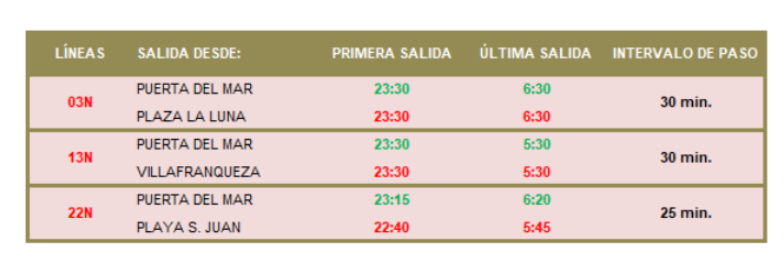 ( 13N ) 13N: Villafranqueza - Plaza del Mar( 22N ) 22N: Puerta Del Mar - Playa San Juan( 03N ) 3N: Puerta del Mar - Plaza de la Luna