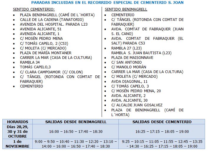 Es comunica als Srs. Usuaris que, amb motiu de la festivitat de Tots Sants, els pròxims dies 28,29, 30, 31 d’Octubre i 1 de Novembre de 2017 es prestarà un servei especial. Els dits serveis, realitzaran les següents parades i tindran el següent horari: