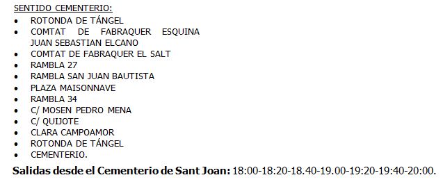 Este servei es reforçarà amb un servei de caràcter circular el dia 1 de Novembre, entre les 18:00 i les 20:00 hores, amb el següent recorregut: