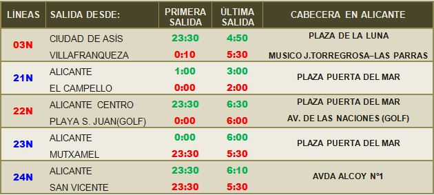 ( 21N ) 21N: Alicante (Plaza Puerta del Mar) - Playa San Juan - El Campello( 23N ) 23N: Alicante (Plaza Puerta del Mar) - Sant Joan - Mutxamel( 24N ) 24N: Alicante (Plaza del Mar) - Universidad de Alicante - San Vicente del Raspeig