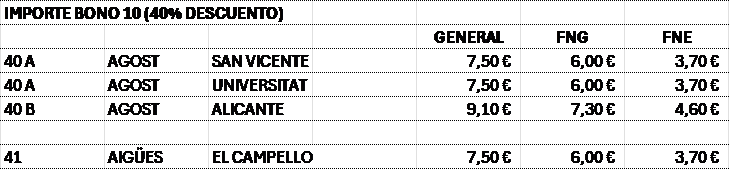 Las recargas de los bonos de 10 viajes modifican su precio según RDL 9/2025 de 25 de junio por el que se establecen reducciones temporales de tarifas en determinados servicios públicos de transporte que son competencia de la Generalitat, entre el 01 de julio y el 31 de diciembre de 2025, según se muestra en la siguiente tabla.