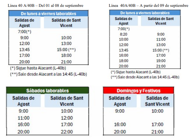 Se comunica a los Sres. Usuarios y Usuarias que, a partir del 1 de septiembre de 2024 entrarán en vigor los nuevos horarios del servicio 40A (Agost-San Vicente-Universidad) y 40B (Agost-Alicante).