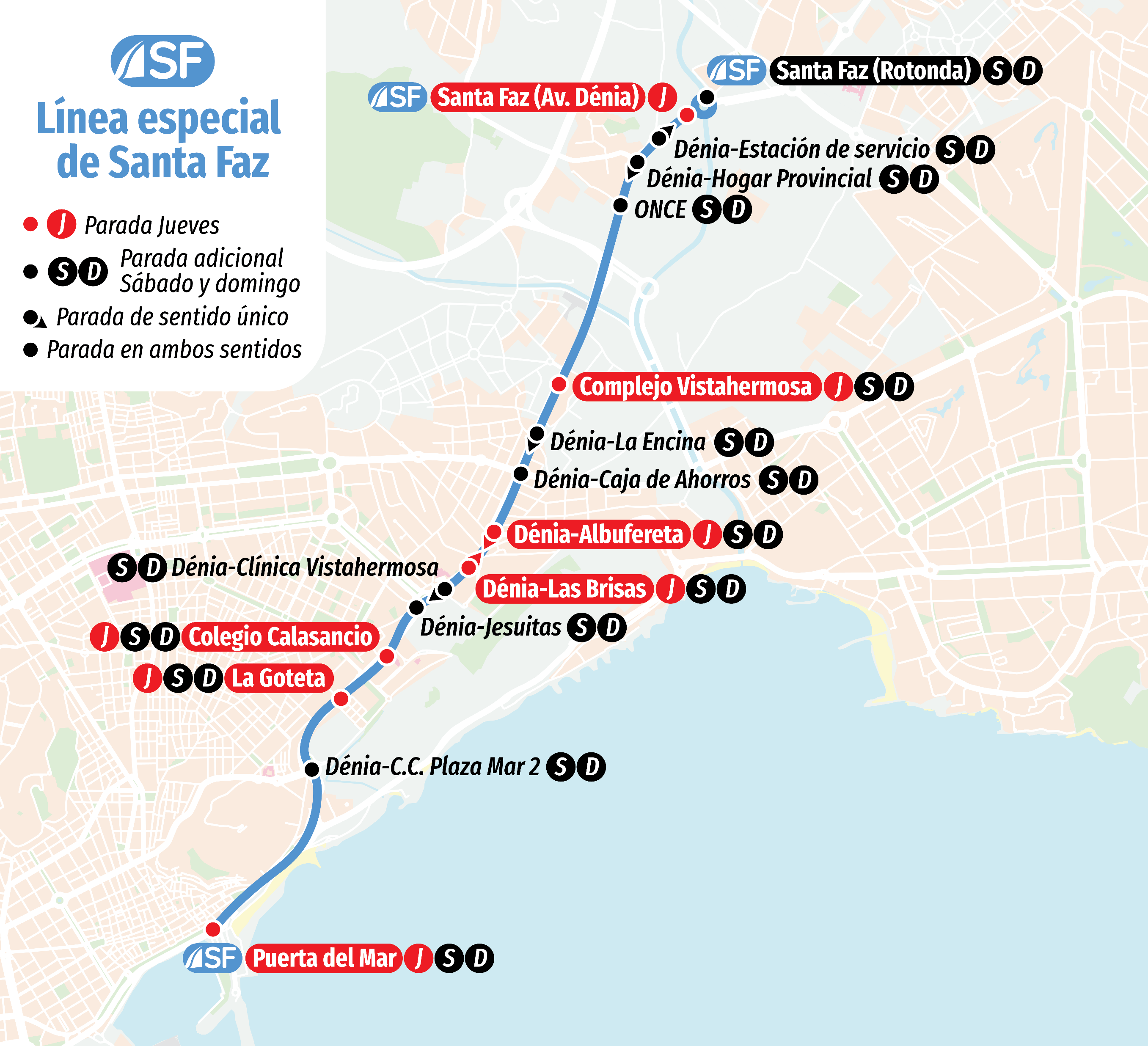Se comunica a los Sres. Usuarios y Usuarias que, con motivo de la festividad de Santa Faz, los próximos días 1, 3 y 4 de mayo se prestará un servicio ESPECIAL SANTA FAZ 6 entre la Plaza Puerta del Mar y el caserío de la Santa Faz, con una frecuencia estimada de: