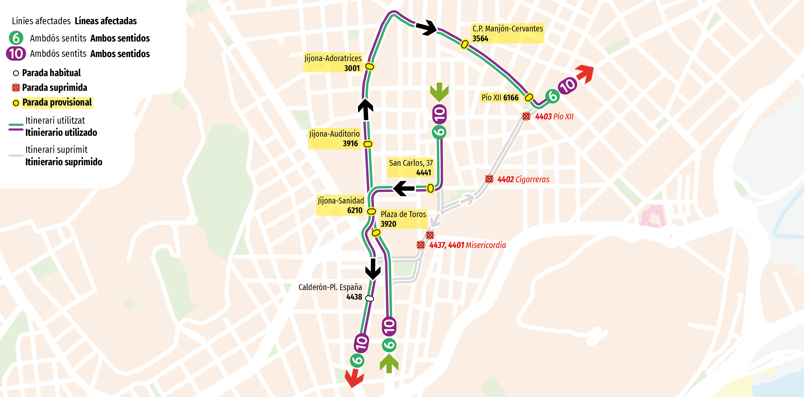 Se comunica a los Sres. Usuarios y Usuarias de las líneas 6 y 10 que por motivo de “ACTO FESTIVO BARRIO SAN ANTÓN” las líneas realizarán el desvío y paradas que se muestran en el plano adjunto.