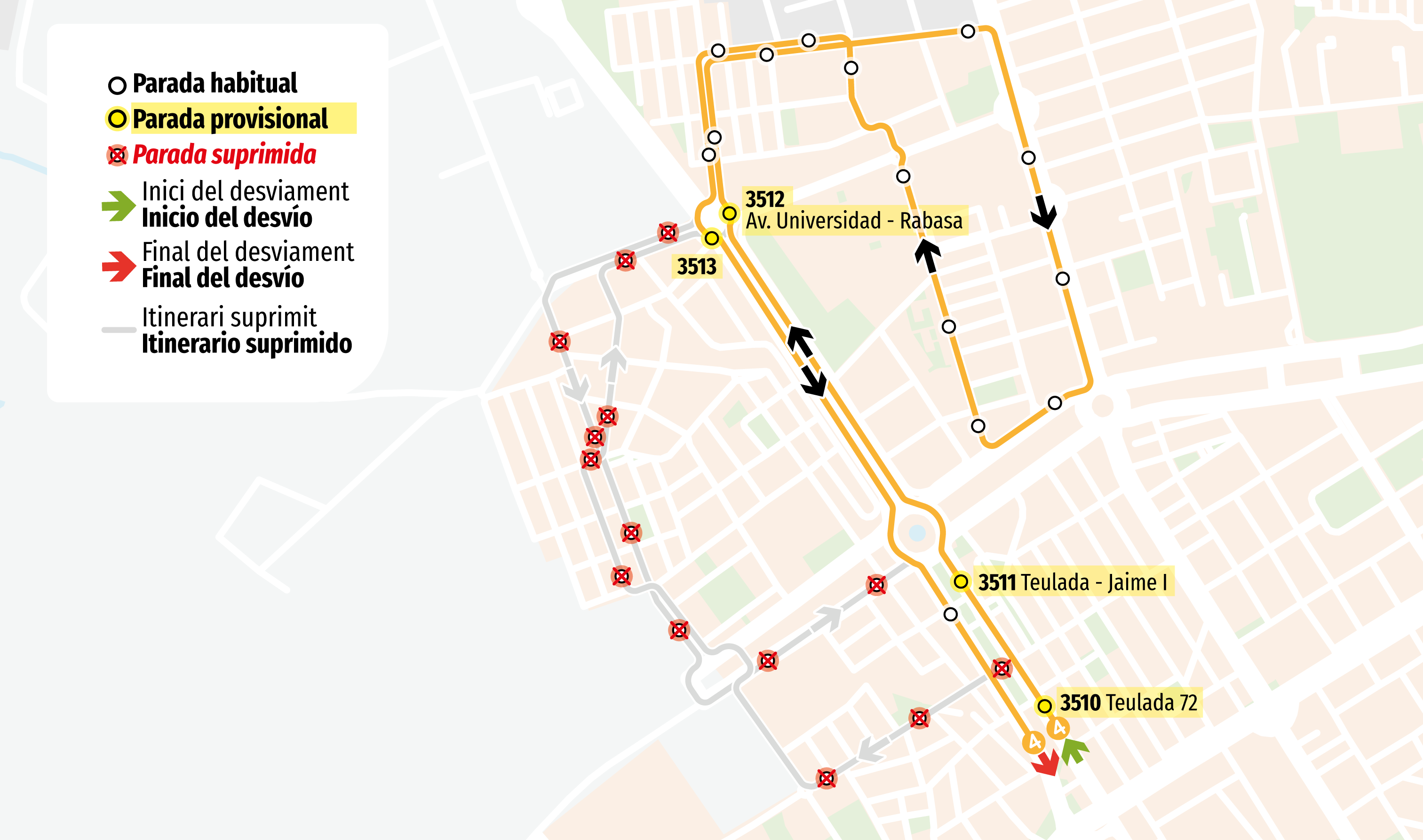 Se informa a los Usuarios y Usuarias de la línea 4 que, con motivo de prueba deportiva en Av. Jaime I, los días 11 y 12 de abril, la línea se verá desviada por Av. Universidad en sentido ida y vuelta, desde inicio del servicio hasta apertura al tráfico de la mencionada vía (día 12 a las 20:00h. Aprox.)