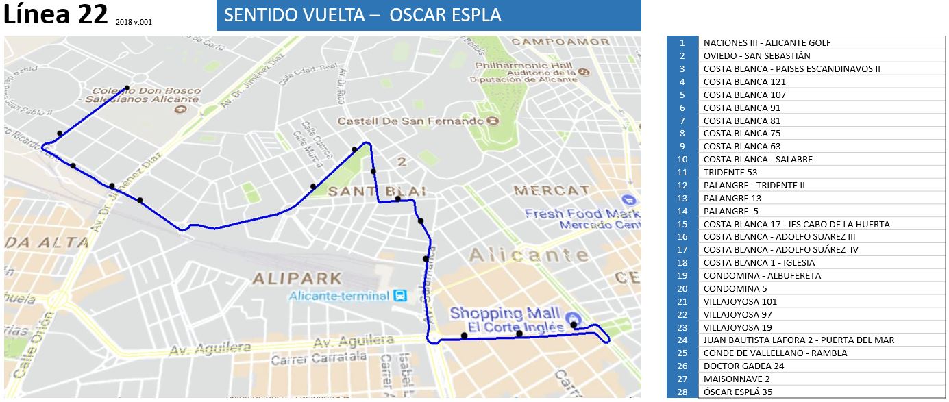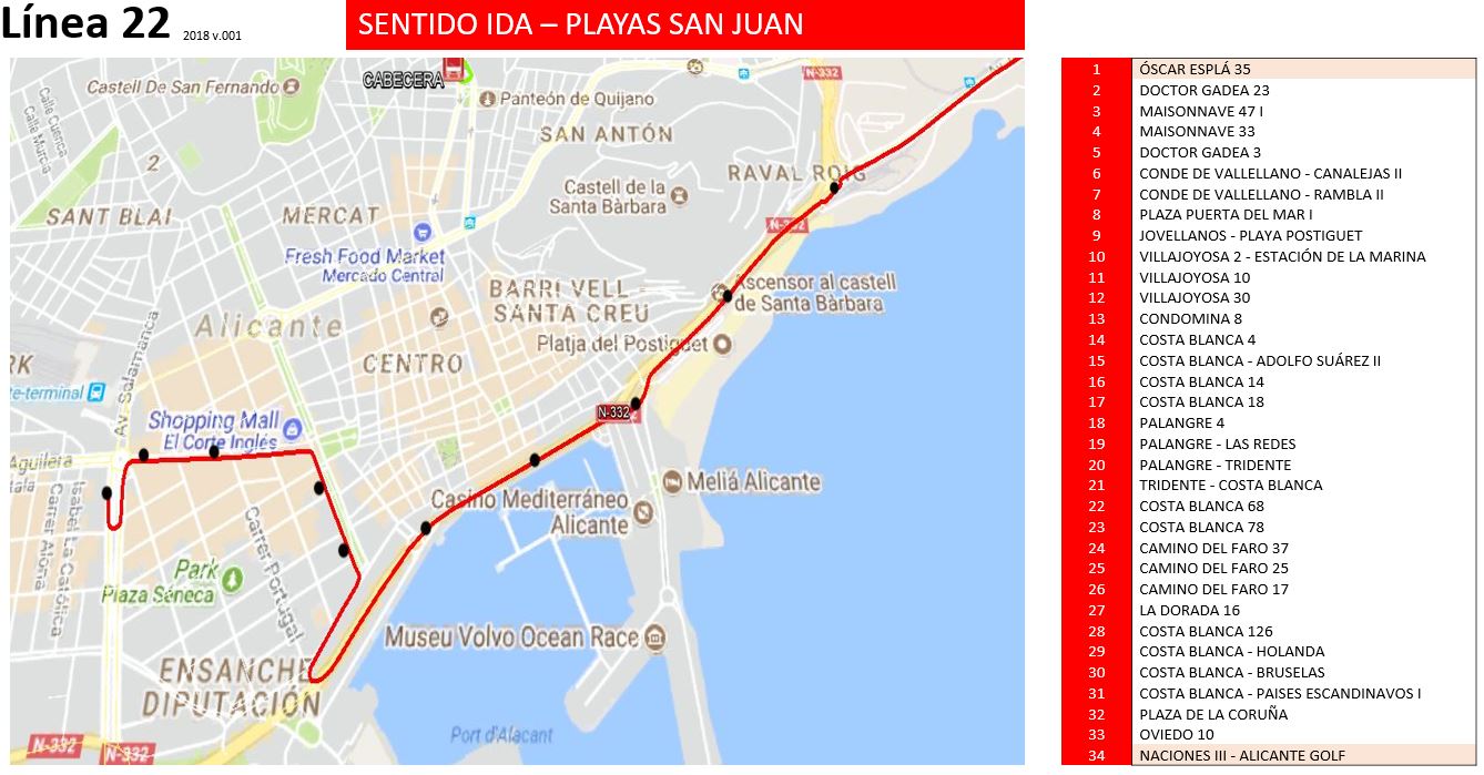 -. SENTIDO ALICANTE: Ruta normal hasta Puerta del Mar, donde continuará por Avda. Conde de Vallellano, Avda. Doctor Gadea, Avda. Maisonnave y Avda. Oscar Esplá (cabecera).
