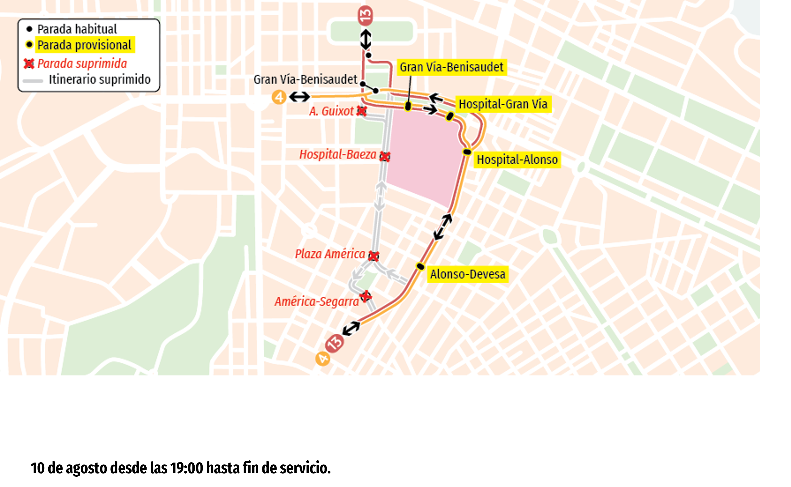 Se comunica a los Sres. Usuarios y Usuarias que, debido a las fiestas de Moros y Cristianos de Altozano, el día 10 de agosto desde las 19:00 hasta fin de servicio, las líneas 4 y 13realizarán el siguiente desvío:
