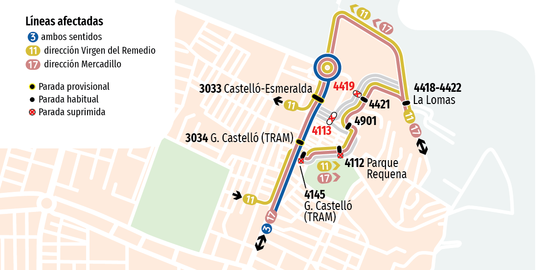 ( 11 ) 11: Virgen del Remedio - Avda. Denia ( 17 ) 17: Plaza Castalla - Mercadillo Teulada( 03 ) 3: Ciudad de Asís - Colonia Requena