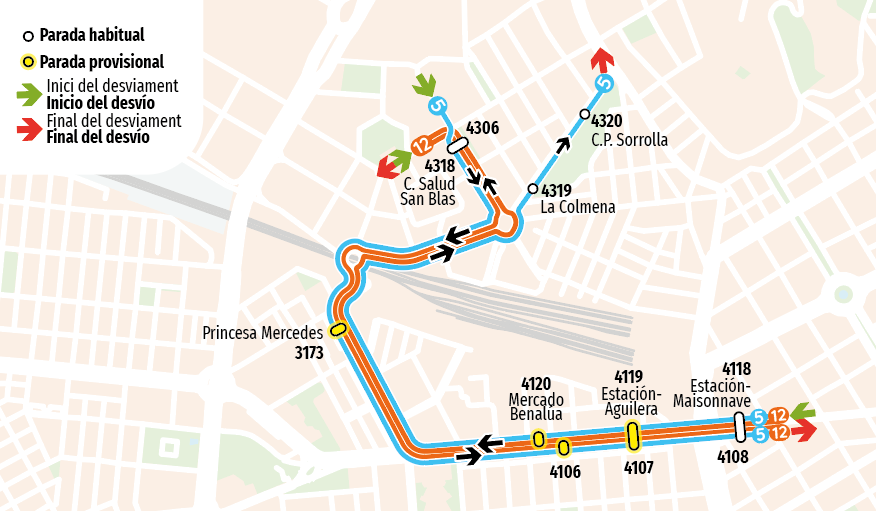 Desde Av. Maisonnave continua por Av. Aguilera, C/ Princesa Mercedes, C/ Ausó y Monzó, C/ Capitán Gral. Gutiérrez Mellado, recuperando su recorrido habitual.