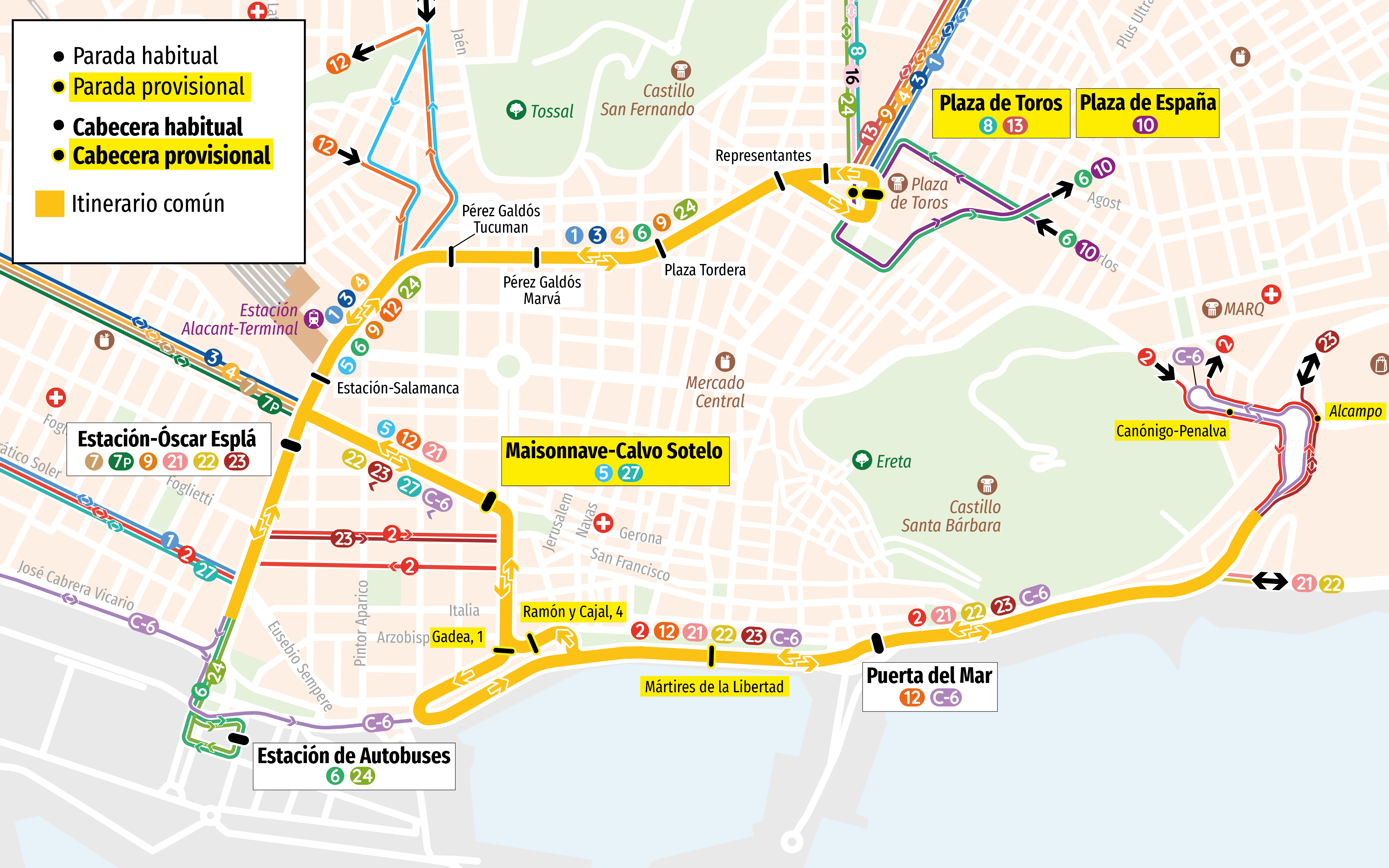 ( 05 ) 05: Rambla - San Agustín( 10 ) 10: Rambla - Vía Parque (C.C. Vistahermosa)( 12 ) 12: Puerta del Mar - San Blas - Juan Pablo II( 13 ) 13: Rambla - Villafranqueza( 01 ) 1: San Gabriel - Ciudad Elegida( 21 ) 21: Alicante - Playa San Juan - El Campello( 22 ) 22: Av. Óscar Esplá - Playa San Juan( 23 ) 23: Alicante - Hospital de Sant Joan - Sant Joan - Mutxamel( 02 ) 2: La Florida - Sagrada Familia( 03 ) 3: Ciudad de Asís - Colonia Requena( 06 ) 6: Estación Autobuses - Juan XXIII (2º S)( 08 ) 8: Rambla - Virgen Del Remedio( 09 ) 9: Óscar Esplá - Playa San Juan( C-6 ) C-6: Alicante - Aeropuerto
