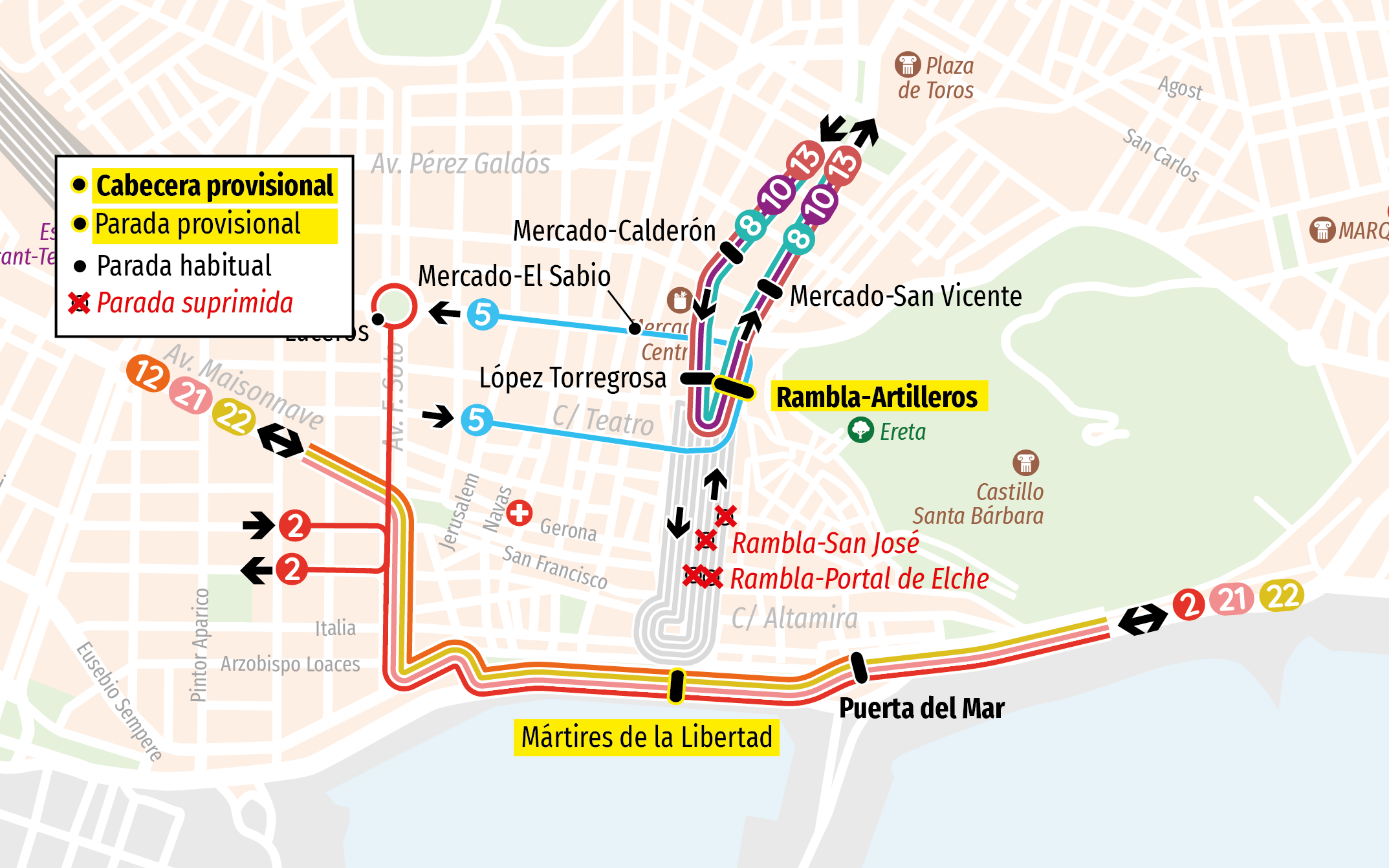 ( 05 ) 05: Rambla - San Agustín( 10 ) 10: Rambla - Vía Parque (C.C. Vistahermosa)( 12 ) 12: Puerta del Mar - San Blas - Juan Pablo II( 13 ) 13: Rambla - Villafranqueza( 21 ) 21: Alicante - Playa San Juan - El Campello( 22 ) 22: Av. Óscar Esplá - Playa San Juan( 22N ) 22N: Puerta Del Mar - Playa San Juan( 02 ) 2: La Florida - Sagrada Familia( 08 ) 8: Rambla - Virgen Del Remedio