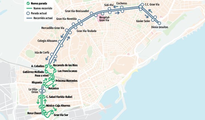 Se comunica a los Sres/Sras usuarios/as que, con motivo de mejorar el servicio, se modifica el recorrido de la línea 14, a partir del día 1 de Abril,  prolongando hasta Gran Vía Sur y por el barrio Princesa Mercedes con una frecuencia de 30 minutos.