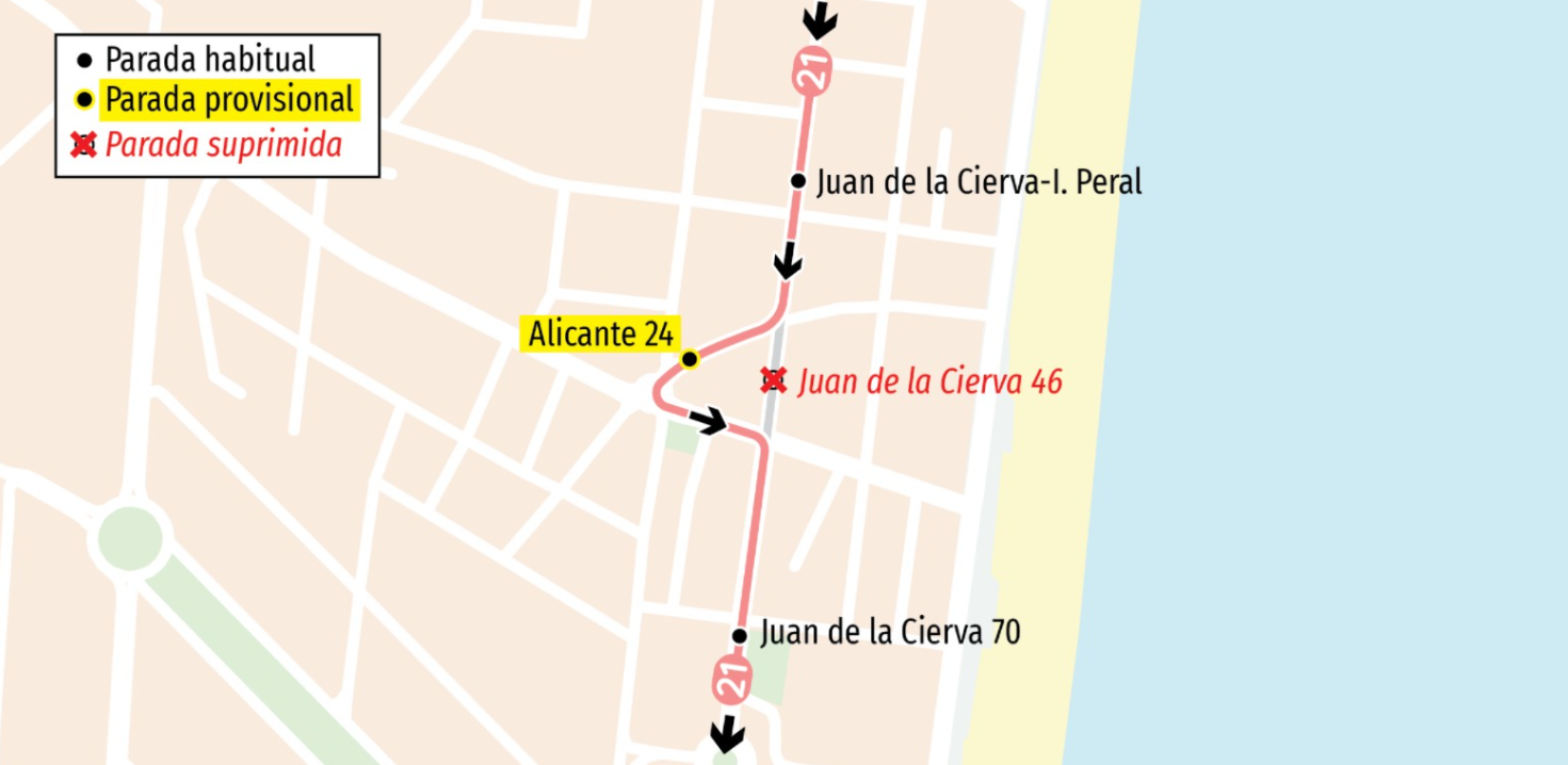 SENTIDO ALICANTE: Desde la C/ Juan de la Cierva nos desviamos por calle Alicante y Carretera Benimagrell hasta de nuevo C/ Juan de la Cierva donde recupera su recupera habitual.