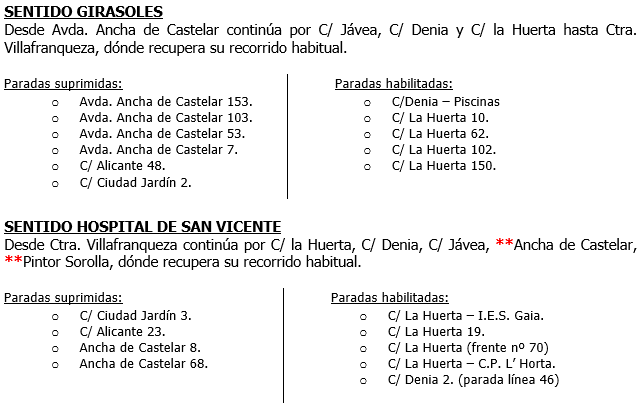 **Días 22- 23 y 24 de julio desde las 07.00h y hasta las 16.00h queda suprimido el recorrido por C/ Espronceda y Benito Perez Galdós por Mascletas ,siendo desviada la línea en sentido barrio los manchegos por C/ Javea C/Elda y Ronda Sur, tanto en ida como en vuelta
