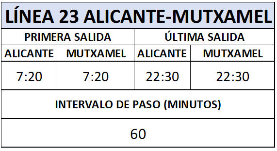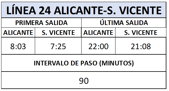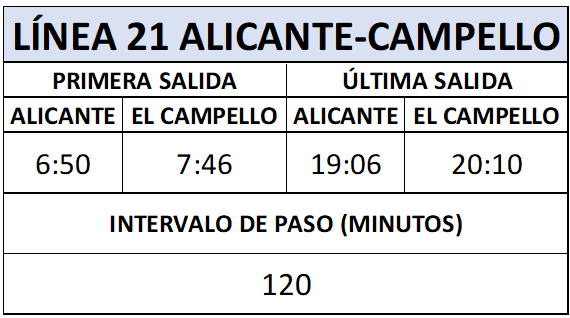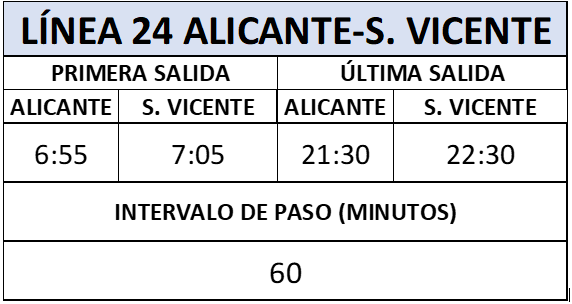 ( 21 ) 21: Alicante - Playa San Juan - El Campello( 23 ) 23: Alicante - Hospital de Sant Joan - Sant Joan - Mutxamel( 24 ) 24: Alicante (E. Autobuses) - Universidad de Alicante - San Vicente del Raspeig